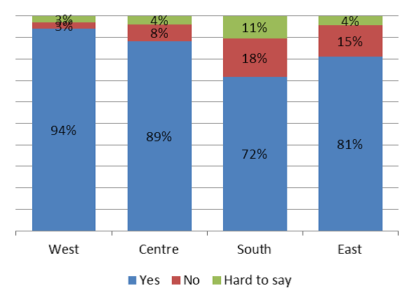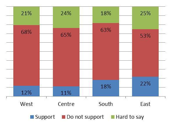 Чуть больше различия, когда речь идет о геополитике. Большинство всех жителей страны ратуют за более тесное сотрудничество как с Россией, так и с Евросоюзом. Если же респондентам предлагалось сделать выбор, что давалось многим из них очень нелегко, то перевешивала привлекательность ЕС - 27 процентов против 17 процентов. Но это в среднем по стране.