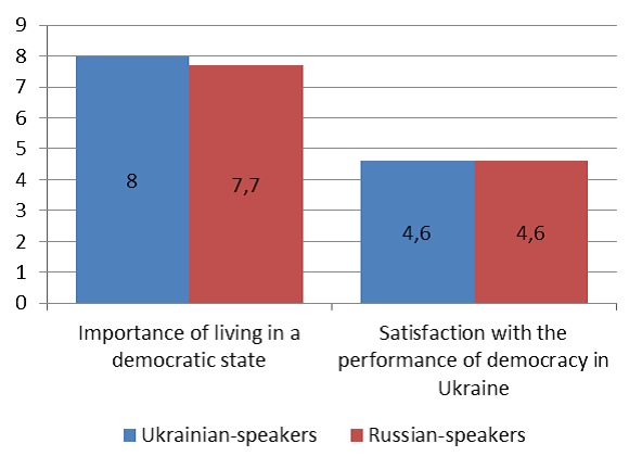 Вымыслом называет Йоанна Фомина утверждение, что восток и запад Украины имеют различные политические преференции. Согласно ее исследованию, ценность демократии для русскоговорящих (оценка 7,7 по десятибалльной шкале) практически столь же велика, как для говорящих по-украински (оценка 8).