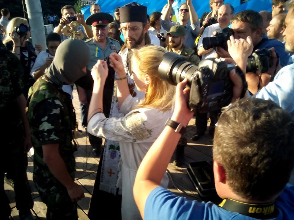 Вскоре мы направились на центральную площадь Мариуполя, где более 5 тысяч горожан митинговали под желто-голубыми прапорами. Митинг проходил со значительным эмоциональным надрывом, в воздухе витала, если не паника, то сильное беспокойство. Все уже знали об утренних боях на подступах к городу. На сцене священник благословлял юношей, дававших клятву на верность народу Украины, а девушки обнимали парней и повязывали им на шею оберег. Все время пока длилась эта процедура, площадь отчаянно аплодировала.