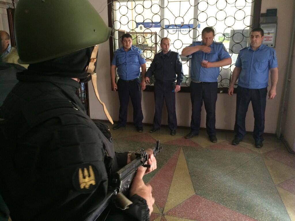 «Все работники милиции потерявшие право служить украинскому народу будут разоружены и отправлены по домам. Все чиновники перешедшие на службу ДНР и тем самым потерявшие легитимность будут отстранены от должностей. Вооруженные люди из ополчения ДНР будут блокироваться и, в случае непосредственной угрозы жизни и здоровью граждан, уничтожаться. Для фиксации реальной ситуации в районе мною приглашены и находятся здесь журналисты нескольких телерадиокомпаний. До нормализации ситуации в районе беру ответственность за жизнь и здоровье граждан Украины и поддержание общественного порядка на себя. Командир добровольческого батальона Донбасс Семенченко».