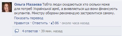 Во-первых. Непрозрачность расходования средств. Спецы по общественному краудфандингу (тот же Навальный) сразу бы сказали украинской армии: собираете средства – отчитывайтесь о расходах. Между тем, сайт Минобороны Украины работает с пятого на десятое, постоянного отчета о закупках и их необходимости не происходит, на Facebook нет каждодневных отчетов (в стиле «а на эти деньги мы купили 100 пестрых одеял»), а в соцсетях муссируются слухи, что деньги пошли на сыр с плесенью для менеджеров из Кабмина. Это неправильно.