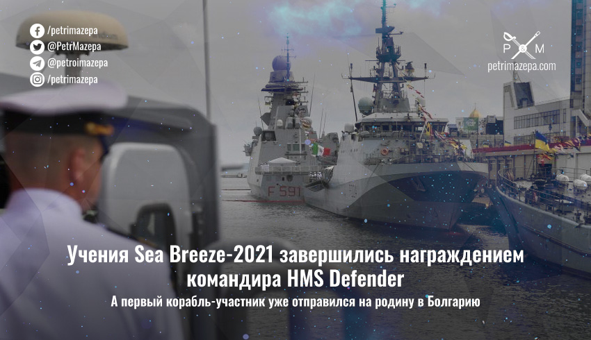 Вчера завершилась активная фаза учений Sea Breeze-2021 – часть кораблей зашла в одесский порт, а болгарский противолодочный корвет «Бодри» ушел на родину. Сегодня в Одессе подвели итоги учений, а также наградили командира британского эсминца HMS Defender и начальника регионального управления Морской охраны контр-адмирала Олега Костура.