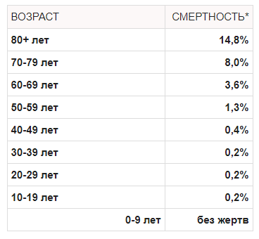 Среди детей до 9 лет смертей от коронавирусной инфекции COVID-19 зафиксировано не было. Дальше же процент смертельных случаев растет от значения 0,2% в группах 10-19 лет, 20-29 лет и 30-39 лет до 14,8% в группе 80+ лет. В Worldmeter отмечают, что среди детей заболевших коронавирусом меньше, чем среди взрослых.