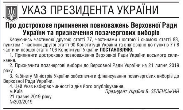 Согласно документу, Верховная Рада VІІІ созыва досрочно прекращает свои полномочия, а внеочередные выборы назначены на 21 июля 2019 года.
