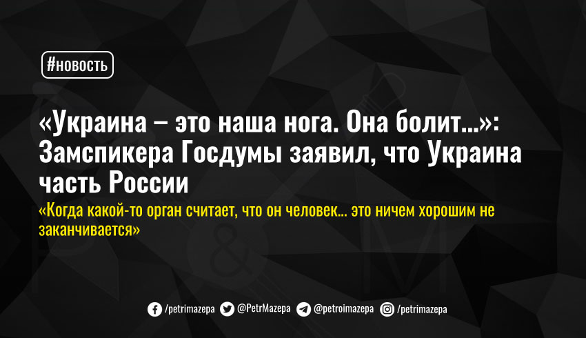 Замспикера Госдумы страны-агрессора Петр Толстой сообщил, что он считает Украину «частью России», и вообще «ногой, которую нужно лечить», а украинцев охарактеризовал как «русских людей».