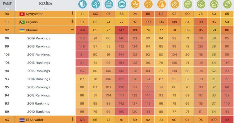 Общий показатель Украины — худший среди стран Восточной Европы, но за год наблюдается прогресс по четырём позициям. При этом улучшение фиксируется третий год подряд.