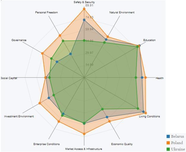 *Слева направо: безопасность, личная свобода, государственное управление, социальный капитал, инвестиционная среда, условия для предпринимательства, доступ к инфраструктуре, качество экономики, условия жизни, здоровье, образование, природная среда