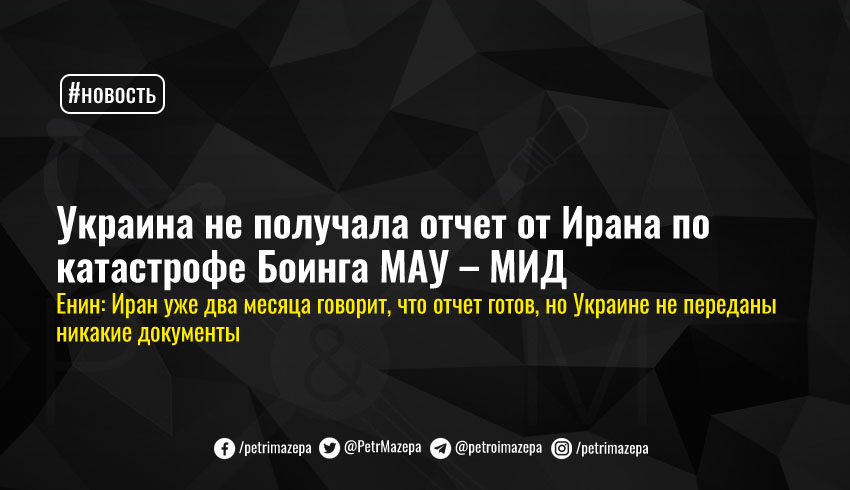 В Министерстве иностранных дел Украины не получали от Ирана отчета по катастрофе Боинга МАУ. Хотя в Иране уже два месяца говорят, что отчет готов, украинской стороне еще не были переданы никакие документы. В то же время в Иране заявили, что отчет Украине и другим пострадавшим странам уже передан.