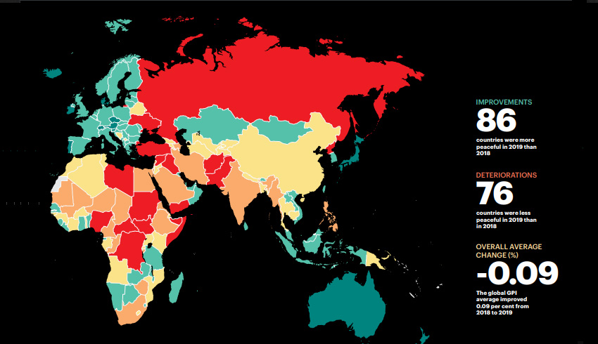Австралийский исследовательский Институт экономики и мира (IEP) обнародовал ежегодный Глобальный индекс мира-2019 (Global Peace Index 2019). Украина уже почти вырвалась из последней группы стран, а РФ – привычно движется ко дну.