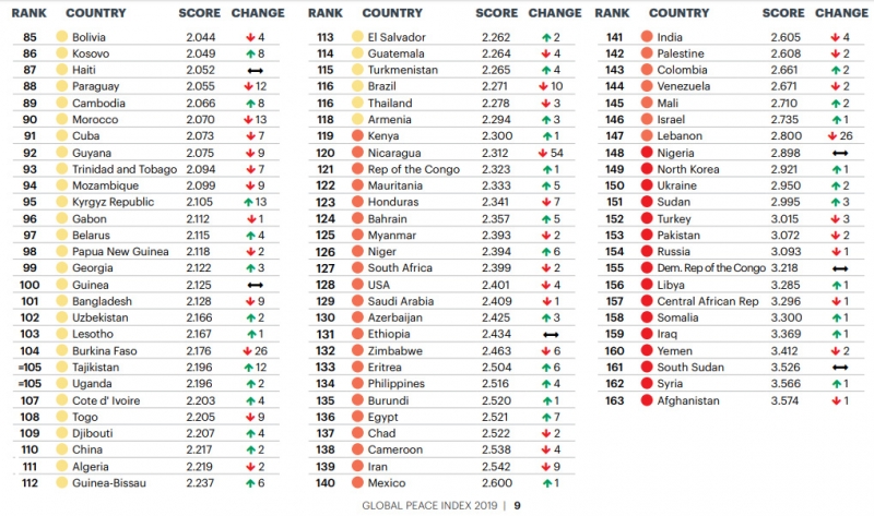 В списке 163 страны. В этом году Украина поднялась на две позиции до 150 места, а РФ просела на одну позицию до 154 места. Согласно рейтингу Сирия (несмотря на все усилия РФ) сместила Афганистан на последнюю позицию. А на первом месте уверенно разместилась Исландия.