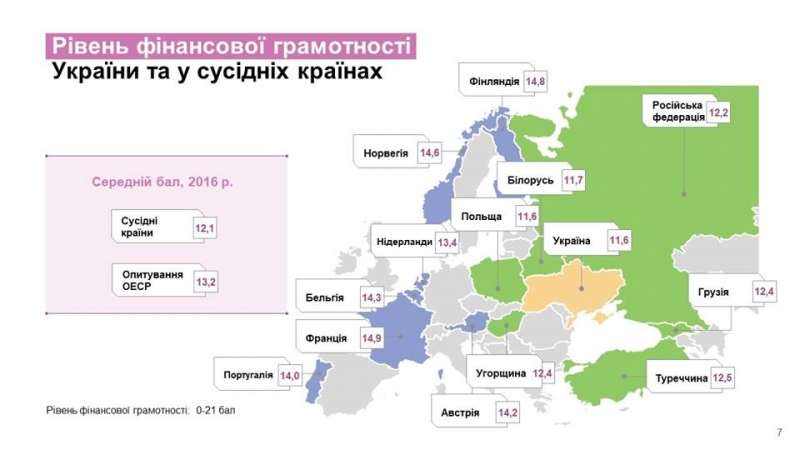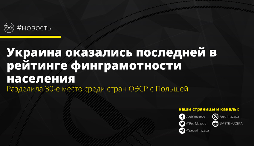 Украина заняла последнее место в рейтинге финансовой грамотности среди стран Организации экономического сотрудничества и развития (ОЭСР), разделив это место по количеству баллов с соседней Польшей. Страны-лидеры по уровню финансовой грамотности – это Франция, Норвегия и Канада с показателями индекса 14,9, 14,6 и 14,6, соответственно.