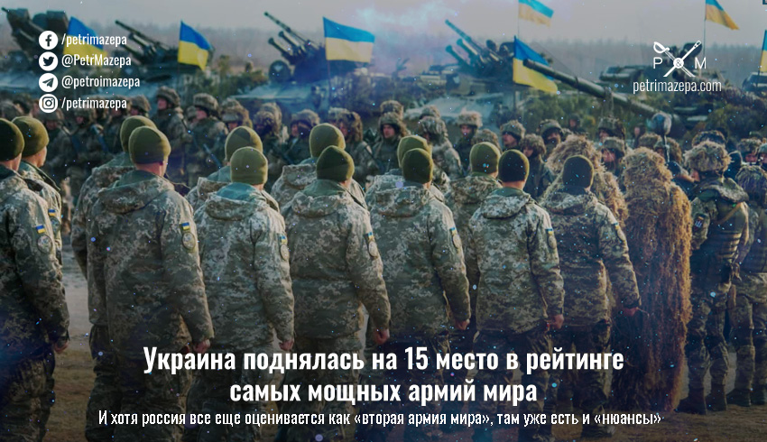 Украина в этом году заняла 15 место из 145 в рейтинге самых мощных армий мира от компании Global Firepower. По этой оценке, ВСУ уже выше армии Израиля, Ирана и Австралии и рядом с армией Египта. В том году ВСУ занимали 22 место