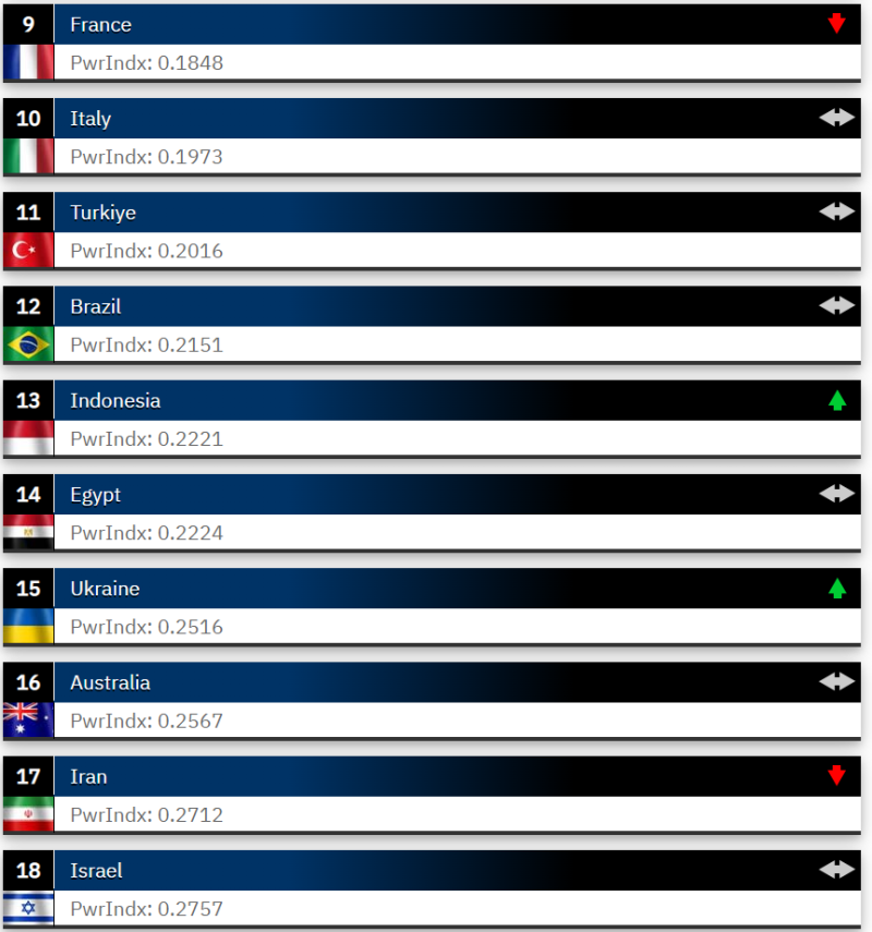Россия в рейтинге все еще занимает второе место, однако «текущая украино-российская война продемонстрировала ключевые ограничения российского военного потенциала, несмотря на ее количественное преимущество в живой силе и материальном обеспечении — проливая свет на проблемы с подготовкой, лидерством, тренировкой и обеспечением», — сообщаетGlobal Firepower. И хотя россия на этот год все еще считается второй армией мира, Китай, третья военная сила в рейтинге, приближается ко второму месту