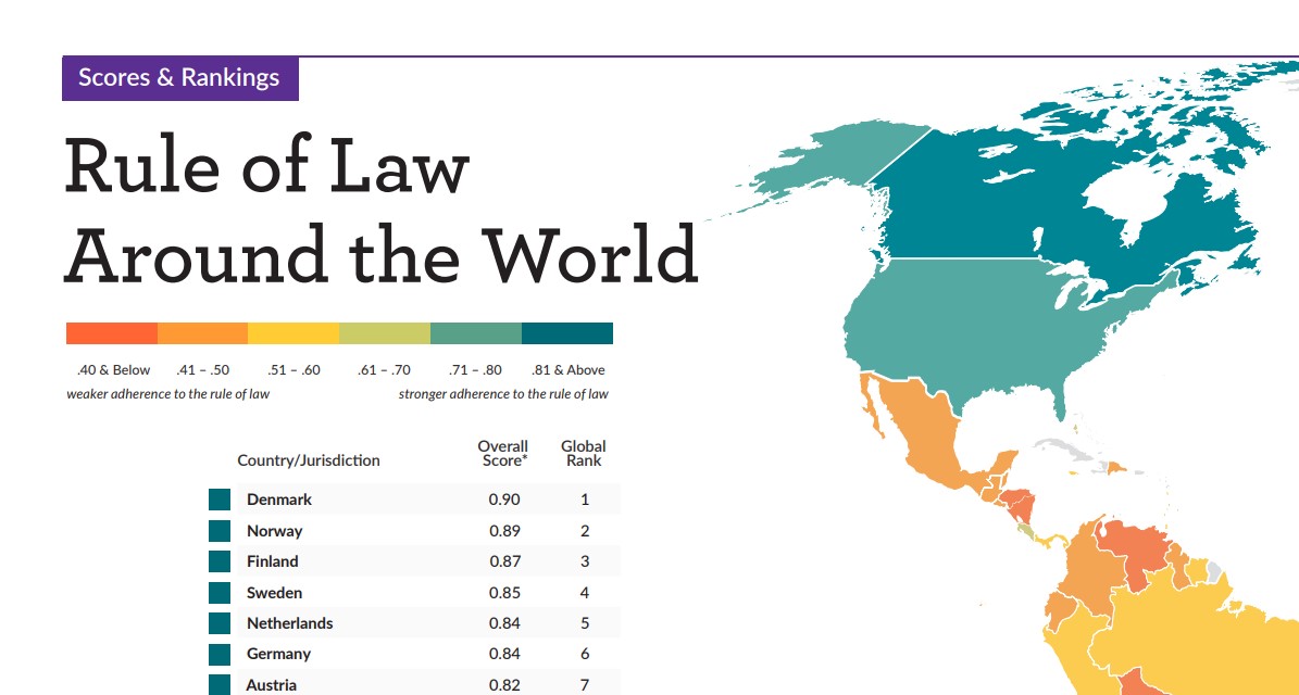 Индекс верховенства права отражает обеспечение законности в стране и рассчитывается с учетом состояния правительственных полномочий, уровня коррупции, открытости правительства, фундаментального характера права, обеспечение порядка и безопасности, гражданского и уголовного правосудия.