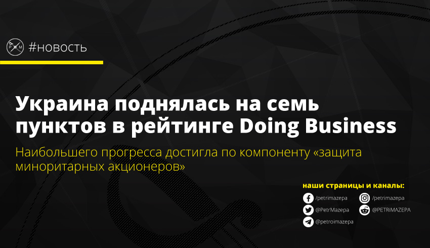 Украина улучшила показатели по шести из десяти индикаторов, которые учитываются специалистами Всемирного банка при составлении рейтинга, сообщает «Правительственный портал». Наибольший прогресс Украина показала по компоненту «защита миноритарных акционеров» (+27 пунктов благодаря открытию информации о конечных выгодоприобретателях), а также по компоненту «получение разрешения на строительство» (+10 пунктов).