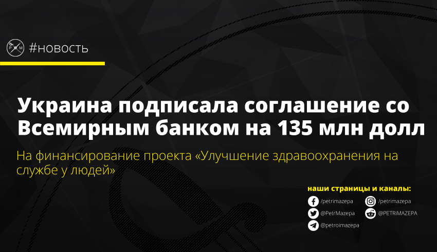 Украина подписала соглашение со Всемирным банком на 135 млн долларов на дополнительное финансирование проекта «Улучшение здравоохранения на службе у людей».