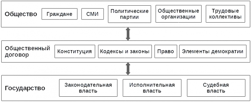 Взаимодействие общества и государства в этой модели осуществляется через общественный договор, построенный на правовом поле конституции и законов, с элементами демократии. Общество включает в себя всех граждан страны; политические партии; различные общественные организации, включая религиозные и профессиональные; СМИ, включая как традиционные газеты, ТВ и радио, так и разные социальные сети и другие коммуникационные средства, возможно, ещё даже и не изобретённые. Государство традиционно состоит из независимых органов законодательной, исполнительной и судебной власти.