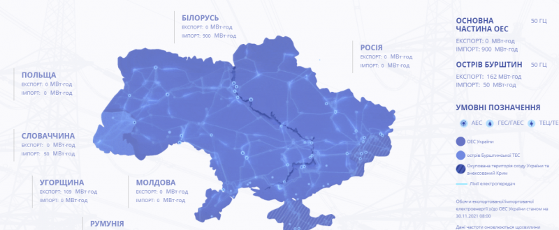 - 18 ноября, Беларусь прекратила экспорт электроэнергии в Украину. По состоянию на 13:00 операции импорта-экспорта в Украине наблюдаются только на Бурштынском энергоострове.
