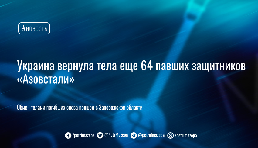 В Запорожской области прошел очередной обмен телами погибших военнослужащих. Украина вернула тела 64 героических защитников «Азовстали» для достойного их захоронения.