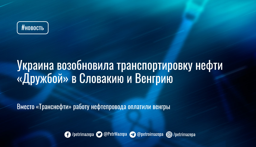 АО «Укртранснафта» возобновило транспортировку нефти по украинскому участку магистрального нефтепровода «Дружба» в направлении Словакии и Венгрии. Это произошло после того, как за транзит вместо российской Транснефти заплатила венгерская нефтяная компания MOL, которая является основным потребителем нефти из трубопровода в стране.