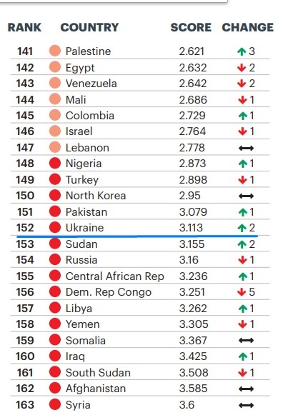 По сравнению с 2017 годом Украина поднялась на две позиции, покинув десятку самых опасных стран мира. На освободившееся место упала Россия, которая опустилась на 1 позицию с прошлого рейтинга.
