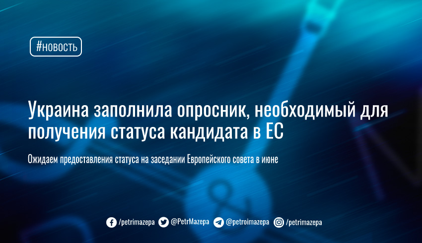 Опросник, необходимый для получения Украиной статуса кандидата в ЕС, уже полностью заполнен. Ожидаем предоставления статуса страны — кандидата на членство на заседании Европейского совета в июне.