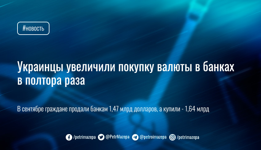 Граждане Украины в сентябре года продали коммерческим банкам наличной и безналичной валюты на 1,47 миллиарда долларов (в эквиваленте) и купили на 1,64 миллиарда.