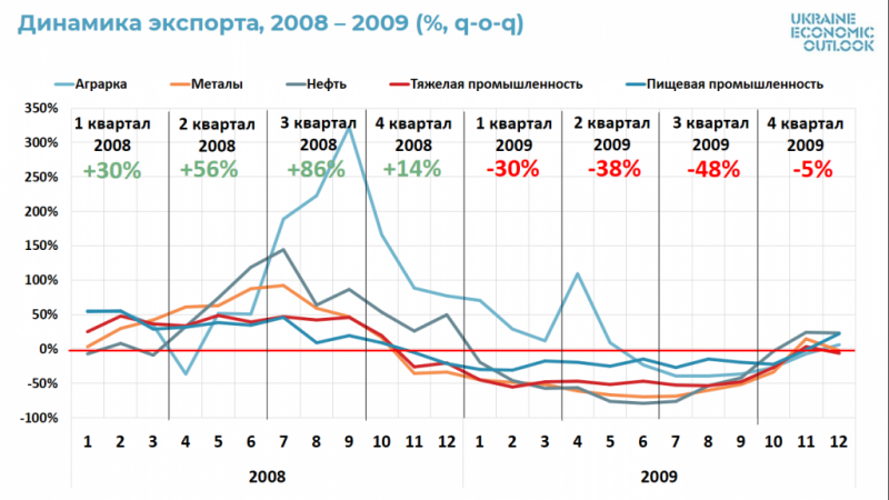 Гораздо оптимистичнее сейчас рынки сельскохозяйственной продукции. Аграрная продукция — на долгосрочном цикле роста. Одновременно Украина активно наращивает сборы зерновых. По ожиданиям многих операторов рынка в ближайшие 5 лет нам удастся достичь отметки в 100 млн тонн, при текущих 70. Поэтому при реализации сценария «мировой кризис» Украина потеряет не более 15-20% аграрной выручки, которая восстановится через 1-2 квартала.