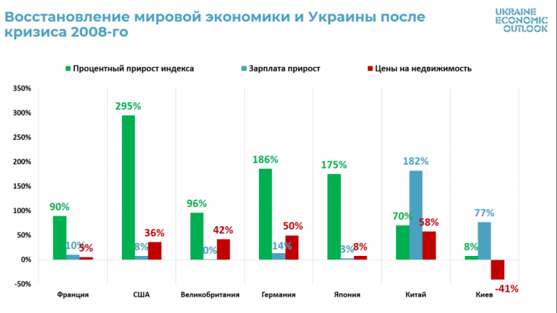 Давайте сравним насколько выросли ключевые индикаторы дохода в Украине с момента последнего кризиса — 2 квартала 2009 года, когда темпы падения нашего ВВП остановились. И так, с последнего кризиса долларовая зарплата в Украине выросла всего лишь на 77%. ВВП, который приходится вместо индекса украинской биржи, всего лишь на 8%, а цены на недвижимость в Киеве — упали сравнительно с 2009 годом на 40%.