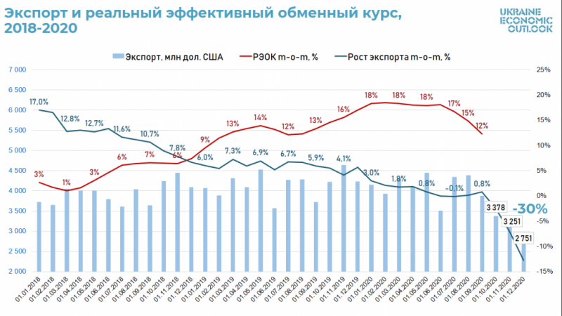 Отмечу, в нём учитывается не только инфляция и обменный курс Украины (относительно доллара), но и их изменение относительно валют всех наших торговых партнёров, покрывающих 90% торгового баланса. Если Национальный банк не пожертвует ориентирами по снижению инфляции в самом начале 2020 года, то уже в июле мы уже столкнёмся с отрицательными темпами прироста экспорта. Август и сентябрь — за счёт рекордного урожая немного выровняют ситуацию, но в действительности трендовый прирост экспорта к сентябрю снизится до нуля или даже отрицательных значений.