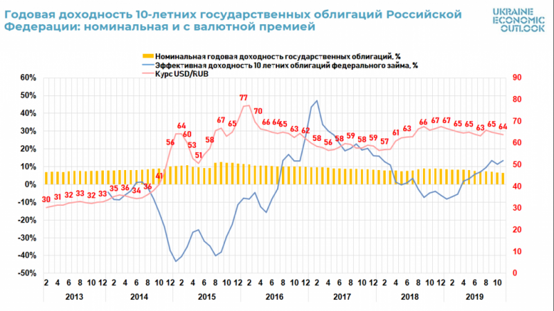 Есть ещё одна страна, которая так же, как мы и сейчас, продавала обязательства правительства на тренде курсовой ревальвации, повысила их эффективную валютную доходность до 35-40% и привлекла почти $30 млрд дополнительного иностранного капитала. Речь о номинальных ставках облигаций Российской Федерации доходностью в 10-12% и периоде ревальвации рубля с 70 до 56 руб./$ в 2016-2018 гг.