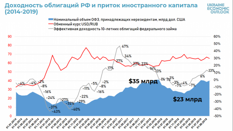 С точки зрения наблюдений за моделью поведения нерезидентов примечательно, что при закреплении курса на отметке в 60 рублей (валютная доходность снизилась до 20-23%) их приток остановился. А при «развороте» рубля до 60 начался отток нерезидентов, их портфель облигаций федерального займа снизился с $35 млрд до $23 млрд или на 35%.