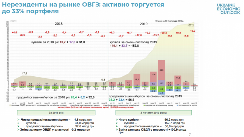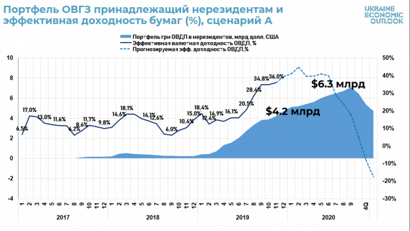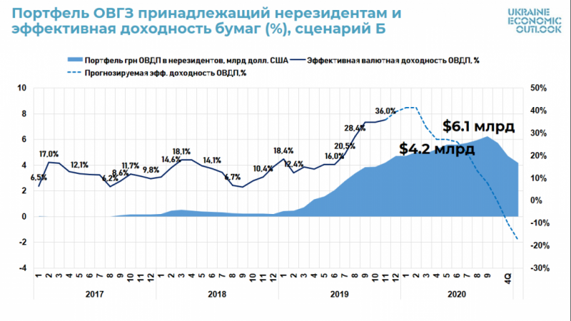 Несознательно, но Украина пошла по тому же пути. Конечно, мы гораздо меньше с точки зрения экономики, поэтому Украина нарастила портфель нерезидентов в гривневых ОВГЗ лишь с $0,2 млрд до $4,3 млрд. К слову, пиковая валютная доходность однолетних ОВГЗ в ноябре 2019-го составила 36% годовых. Исходя из базовых курсовых прогнозов: плавной девальвации с начала года и продолжения ревальвации до июля 2020-го, портфель нерезидентов может вырасти ещё на $2 млрд — до $6,3 млрд.