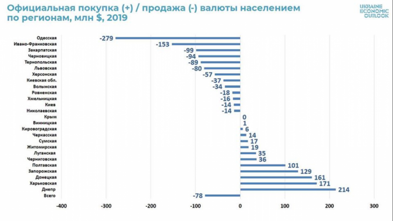 Четвёртый фактор давления на платёжный баланс — это скупка валюты населением. Если мы посмотрим на обобщённую статистику Национального банка, то население выступает в ней чистым продавцом валюты. Но если рассмотреть региональный разрез, то мы увидим — это лишь искажение за счёт Западной Украины (незадекларированного притока валюты от мигрантов) и припортовых областей (экспортная выручка продавцов зерна, полученная от трейдеров).