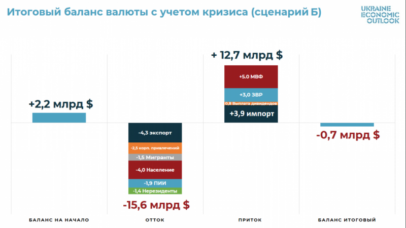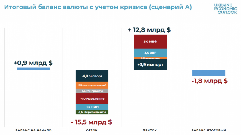 Во время кризиса они станут в очередь на выход и начнут распродавать свой портфель в $6 млрд, конечно, предлагая дисконты, в отличие от Министерства финансов, которое не сможет предложить такие же эффективные ставки доходности. Соответственно, размещения Минфина придётся чем-то замещать. По политическим причинам, очевидно, что снизить расходы госбюджета внепланово на указанные 30-35% невозможно. В итоге покупателем ОВГЗ выступит НБУ и будет вынужден эмитировать около 50-60 млрд грн. Возможно больше, если упадут другие поступления: налог на прибыль, налог на доходы физлиц и другие. Понятно, в это же время полностью упадёт спрос на депозитные сертификаты — а это сегодня до 40 млрд грн по факту отложенной эмиссии.