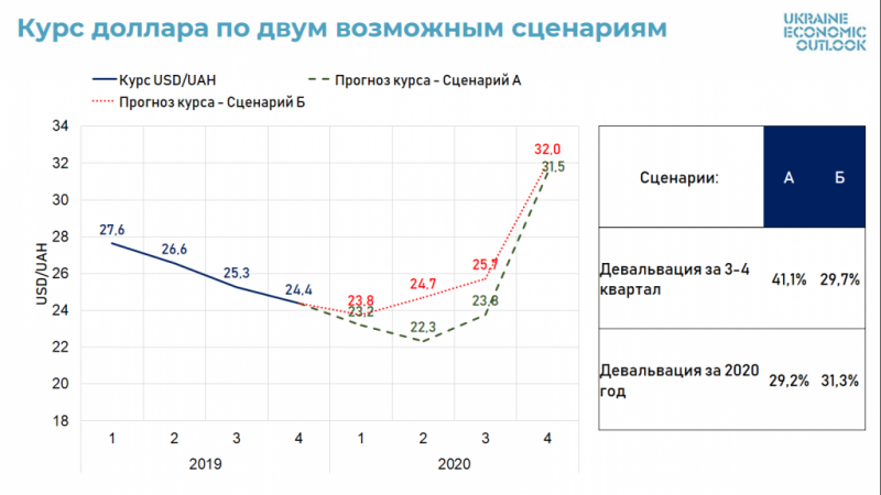 Итоговое влияние на курс. Динамика курса при мировой рецессии в 4 квартале 2020 года почти идентична — до 31,5 грн/$ при сценарии А и 32 грн/$ при сценарии Б.