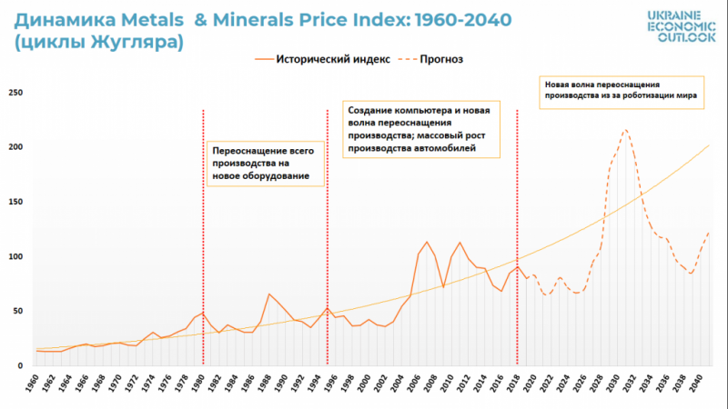 Что касается металлов, то мировые цены на них в основном двигаются по 8-11 летним циклам Жугляра. Сейчас мы находимся в фазе спадающего цикла, начавшегося в 2018 году. Плавный спад продолжится ориентировочно к 2022-му. Но уже с 2023-2024, согласно прогнозам, металлы должны перейти к фазе активного роста, вызванного началом массовой роботизации.