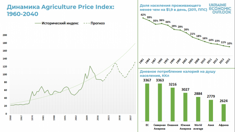 Также нельзя не упомянуть, что есть факторы, способные значительно ускорить темпы роста на аграрную продукцию: снижение мировой бедности и преодоление голода. Так, количество населения, проживающего на менее чем $2 в день (по паритету покупательной способности в ценах 2011 года) стремительно сокращается. Соответственно, учитывая текущий разрыв в потреблении калорий на душу населения между ЕС, Северной Америкой и Азией, Африкой, аграрный рынок сохраняет значительный потенциал к росту.