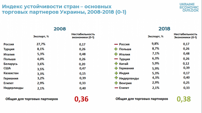 Поэтому наряду с прогнозом поведения мировых рынков сырья есть более пессимистичный аспект: основные торговые партнёры Украины являются неустойчивыми, с точки зрения экспорта, странами. Мы специально сделали индекс устойчивости основных потребителей продукции Украины. И, к сожалению, их средневзвешенная оценка составляет сейчас всего 0,38 (в индексе от 0 до 1), против 0,36 в 2008-м.