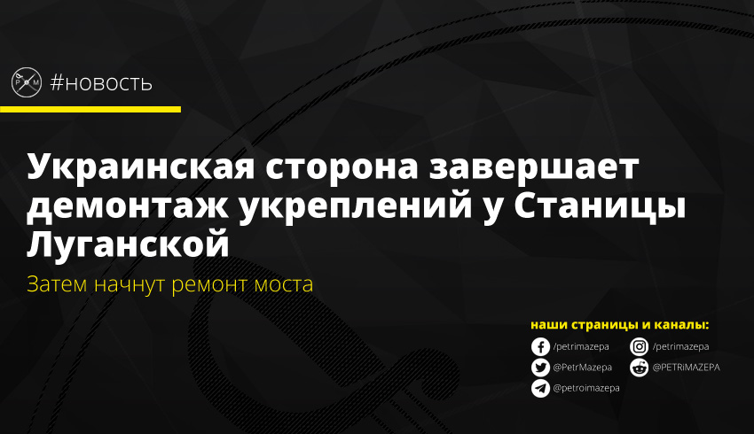 Украинская сторона заканчивает проведение работ по демонтажу фортификационных сооружений и готова к началу работ по ремонту моста, сообщает пресс-центр штаба ООС. Вместе с тем уточняется, что украинские военные укрепляют свои позиции и занимаются оборудованием опорных пунктов на линии соприкосновения, чтобы в случае обострения ситуации иметь возможность «дать адекватный ответ боевикам».