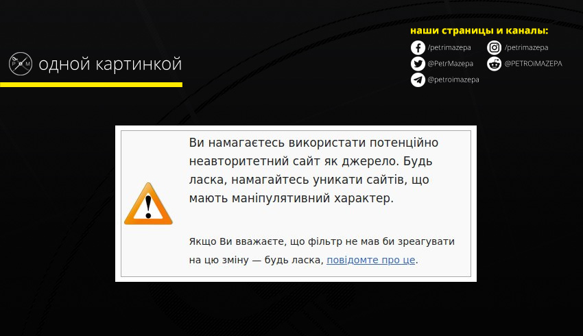 С 25 сентября украинская версия Википедии начала предупреждать, пользователей при внесении изменения с использованием пропагандистских сайтов. Известно, что предупреждение касается всех новых правок, но распространяется ли оно на уже имеющиеся ссылки – неизвестно