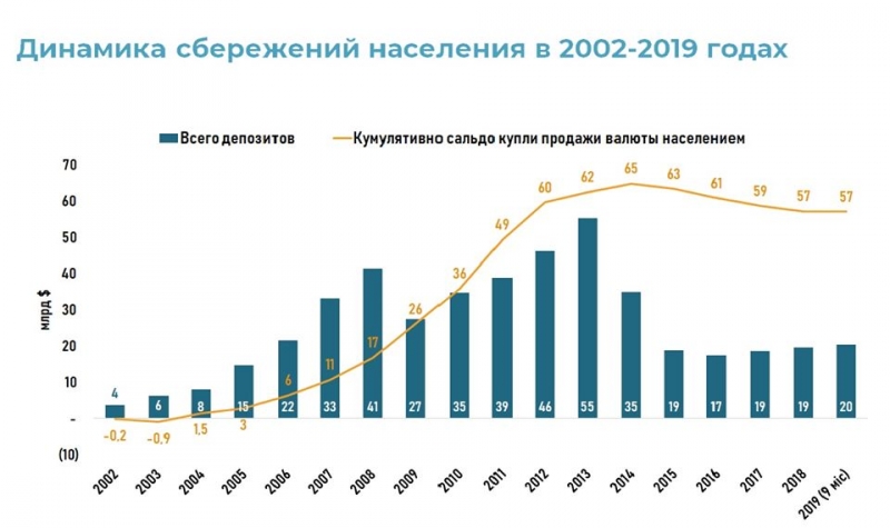При этом "на пике" сбережения населения в банках составляли лишь 55 млрд долларов. Затем, уже после банковского кризиса 2014-15 годов, вообще снизились до 15-20 млрд долларов. Это вы можете увидеть на графике №2.