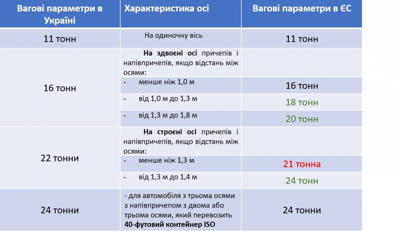 Действующие правила дорожного движения в Украине допускают максимальную фактическую массу автомобиля в размере 40 тонн, а для контейнеровозов - 44 тонны. А в Европе с массой в 40 тонн могут двигаться только «отдельные, как правило комбинированные, грузовые автомобили с 4-6 осями, тогда же как для наиболее распространенных в Украине 2-осных и 3-осных грузовиков такие параметры установлены на уровне 18-24 тонн. Это объясняется тем, что 40-тонный 2-осный автомобиль вызывает в десятки раз больше разрушительного воздействия на дорожное покрытие, чем при условии, что аналогичный груз перевозился бы автопоездом».