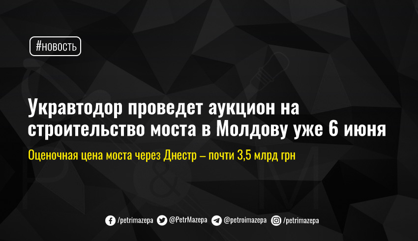 В «Укравтодоре» сообщили, что уже объявлен тендер на строительство пограничного моста в Ямполе, который должен связать Украину и Молдову. Оценочная цена полного комплекта работа по проектировке и строительству моста через Днестр – 3 млрд 460 млн грн. Шаг понижения цены на аукционе 6 июня будет 0,5%.