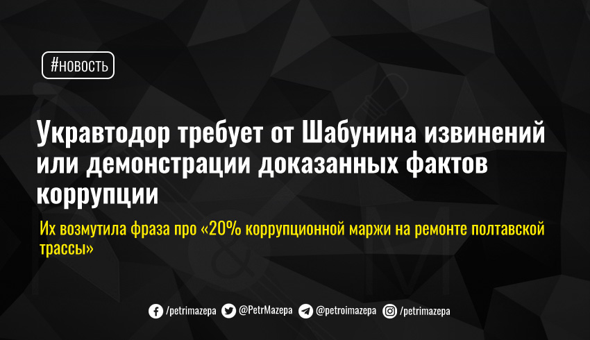 «Укравтодор» опубликовал заявление, в котором потребовал от главы «Центра противодействия коррупции» Виталия Шабунина приведения фактов коррупционных сделок при ремонте полтавской трассы, который осуществлялся в рамках «Большого строительства». Либо же, если таких фактов Шабунин не найдет – то извинения.