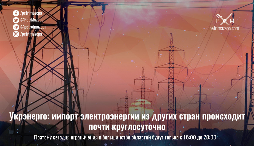 НЭК «Укрэнерго» отмечает, что «в течение почти всех суток происходит импорт электроэнергии из других стран». Поэтому сегодня ограничения в большинстве областей будут действовать только на период с 16:00 до 20:00. В остальное время суток ограничение потребления применять не планируется.