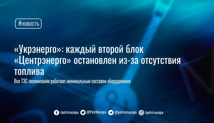 «Укрэнерго»: каждый второй блок «Центрэнерго» остановлен из-за отсутствия топлива
