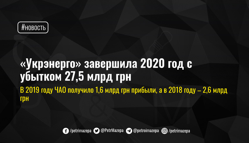 «Укрэнерго» завершила 2020 год с убытком 27,5 млрд грн