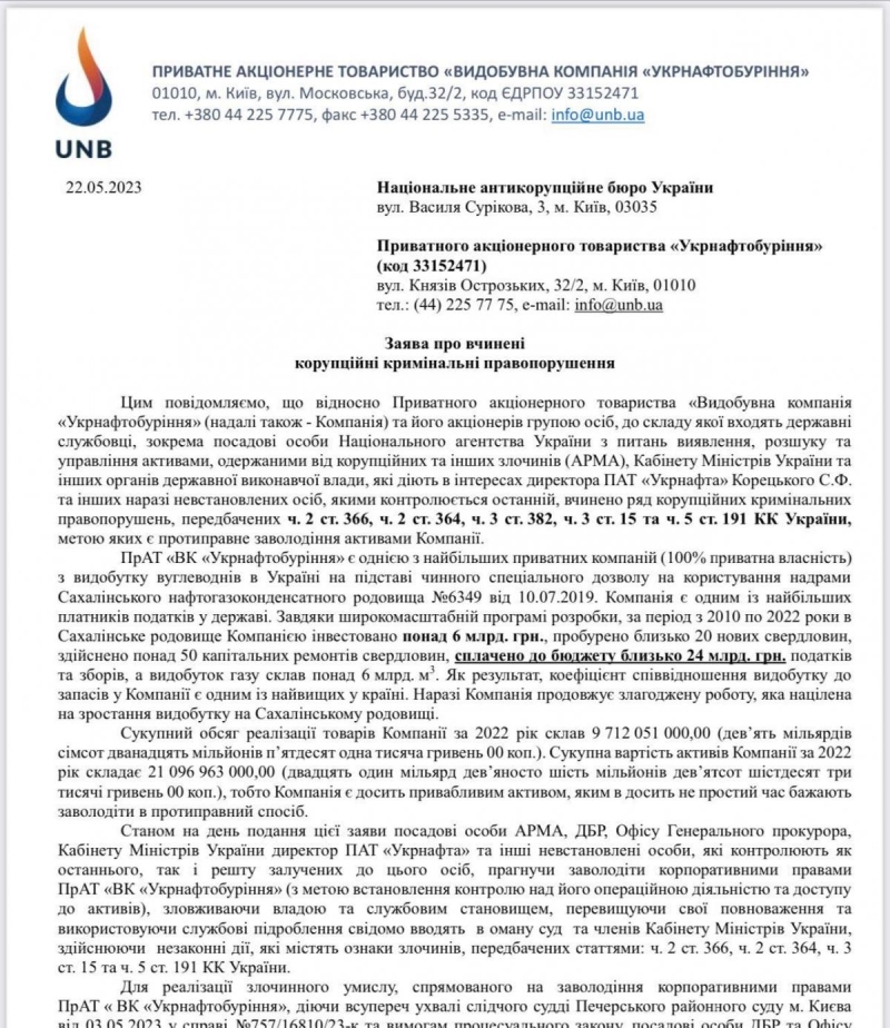 Газодобывающая компания «Укрнафтобуріння» обратилась в НАБУ с призывом расследовать вопросы передачи арестованных активов компании в управление ПАО «Укрнафта».