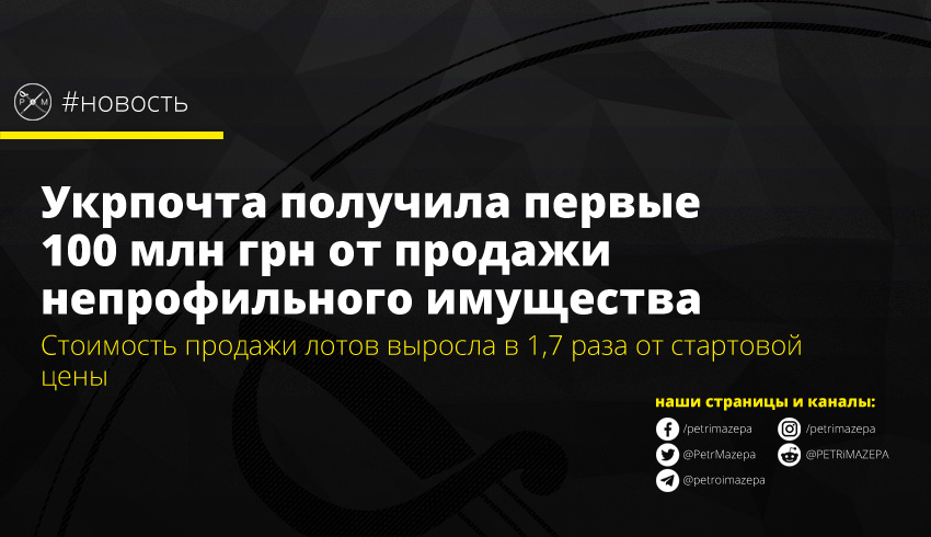 На счета Укрпочты поступили первые 100 миллионов гривень от продажи недвижимости, которая не используется в хозяйственной деятельности. Эта сумма набралась за 22 успешных аукциона, в которых приняли участие 78 потенциальных покупателей.